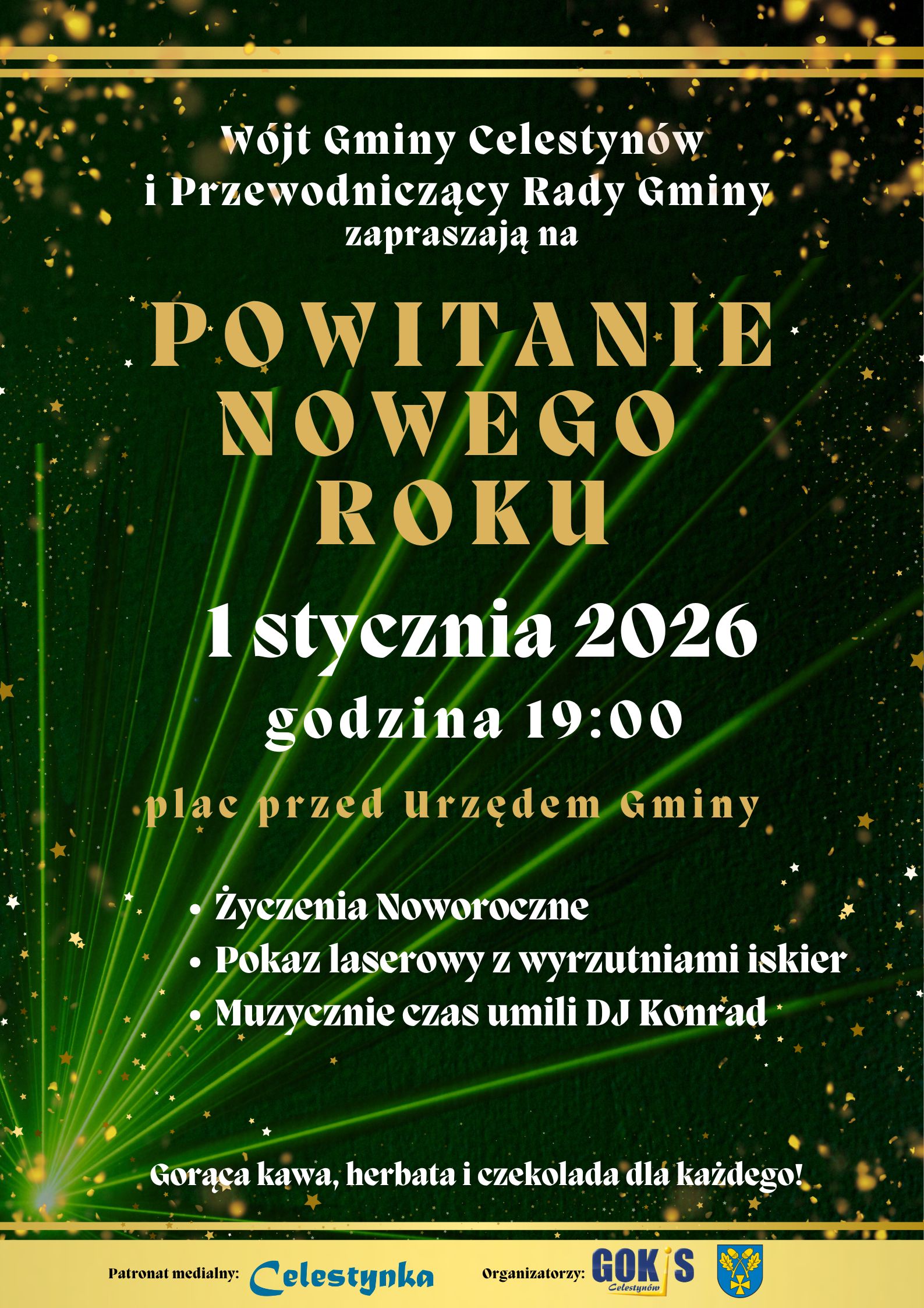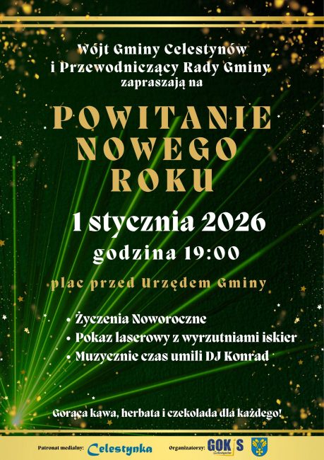 Aktualności Imprezy Najnowsze wydarzenia 11/12/2025 Powitanie Nowego Roku 2026 Zapraszamy na Powitanie Nowego Roku 2026!! Termin: 1 stycznia 2026 r. Godzina: 19:00 Miejsce: plac przed Urzędem Gminy Celestynów