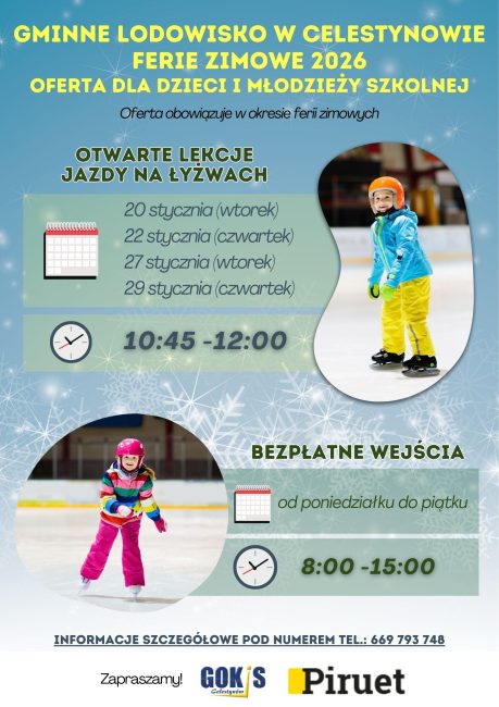Aktualności Imprezy Najnowsze wydarzenia Najważniejsze wydarzenia 08/01/2026 Ferie zimowe z Lodowiskiem Gminnym w Celestynowie Zapraszamy do skorzystania z oferty Gminnego Lodowiska w Celestynowie dla dzieci i młodzieży szkolnej w okresie ferii zimowych!