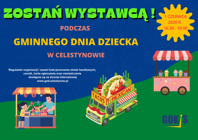 Aktualności Najnowsze wydarzenia 15/04/2026 Gminny Dzień Dziecka – zapraszamy wystawców! Gminny Dzień Dziecka w Celestynowie – zapraszamy wystawców! Regulamin stoisk Dzień Dziecka Załącznik nr 1 cennik Załącznik nr 2 Karta zgłoszenia Załącznik nr 3 oświadczenie