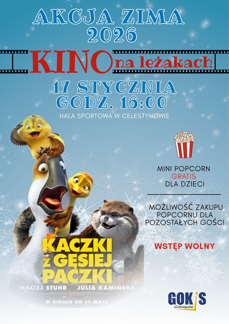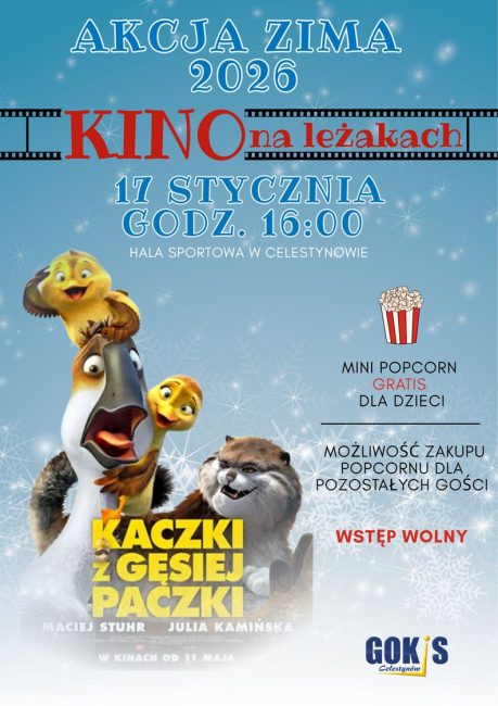 Aktualności Imprezy Najnowsze wydarzenia 09/01/2026 Kino na leżakach „Kaczki z gęsiej paczki” KINO NA LEŻAKACH Zapraszamy na seans familijny! „Kaczki z gęsiej paczki” – pełna humoru, wzruszeń i przygód animacja, która rozbawi dzieci i dorosłych! 17 stycznia 2026 r. Hala Sportowa w Celestynowie Wygodne leżaki Klimat prawdziwego kina Film idealny na zimowy wieczór Przyjdźcie całą rodziną, rozsiądźcie się wygodnie i dajcie się porwać filmowej przygodzie To świetna okazja, żeby spędzić wspólny czas i zacząć ferie z uśmiechem