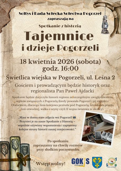 Już 18 kwietnia o godz. 16:00 w świetlicy wiejskiej w Pogorzeli przeniesiemy się w czasie i odkryjemy tajemnice tej miejscowości.