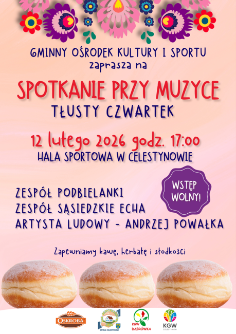 Aktualności Imprezy Najważniejsze wydarzenia 30/01/2026 Tłusty Czwartek 𝗧ł𝘂𝘀𝘁𝘆 𝗖𝘇𝘄𝗮𝗿𝘁𝗲𝗸 𝟮𝟬𝟮𝟲 𝗿.! 𝙎𝙥𝙤𝙩𝙠𝙖𝙣𝙞𝙚 𝙥𝙧𝙯𝙮 𝙢𝙪𝙯𝙮𝙘𝙚 12 lutego 2026 r. godzina 17.00 Hala Sportowa w Celestynowie Zapraszamy